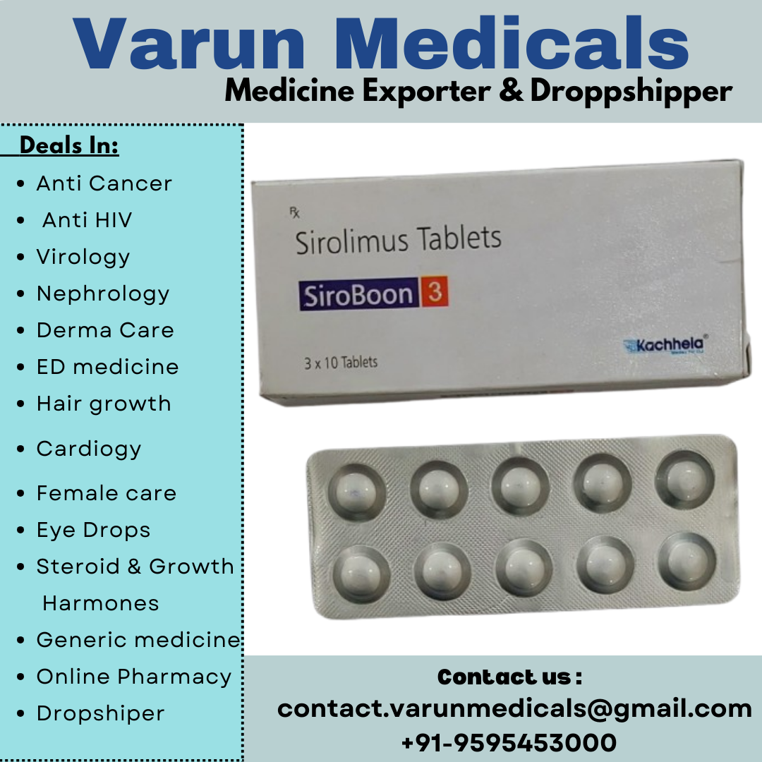 Sirolimus Tablets Supplier, Dealer, Exporter We Varun Medicals Is The Leading Supplier, Dealer, Exporter For Sirolimus Tablets In Dubai, Abu Dhabi, Sharjah, Umm Al-Quwain, Fujairah, Ajman And Ra's Al-Khaimah, Saudi Arabia We Have All Types Of Sirolimus Tablets Available And We Are Supplier, Dealer And Exporter In Dubai, Abu Dhabi, Sharjah, Umm Al-Quwain, Fujairah, Ajman And Ra's Al-Khaimah, Saudi Arabia